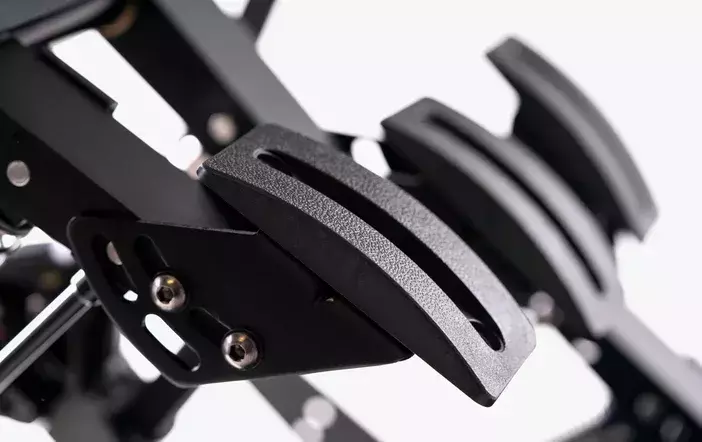 Os ClubSport Pedals V3 Inverted elevam o realismo ao inverter os pontos de pivô de embreagem e freio para a parte superior, replicando o layout de carros de rua/GT. A combinação de célula de carga de 90 kg, damper (amortecedor) ajustável no freio (instalado de fábrica), e sensores Hall 12-bit no acelerador/embreagem entrega controle preciso e consistência em stints longos.